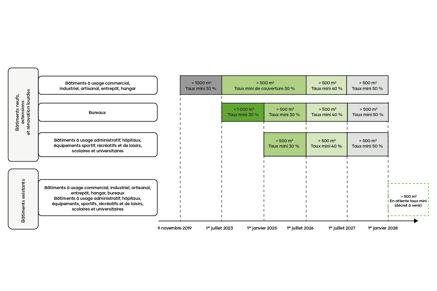 À partir du 1er janvier 2028, l’obligation s’appliquera également aux bâtiments existants d’une superficie minimale de 500 m² :